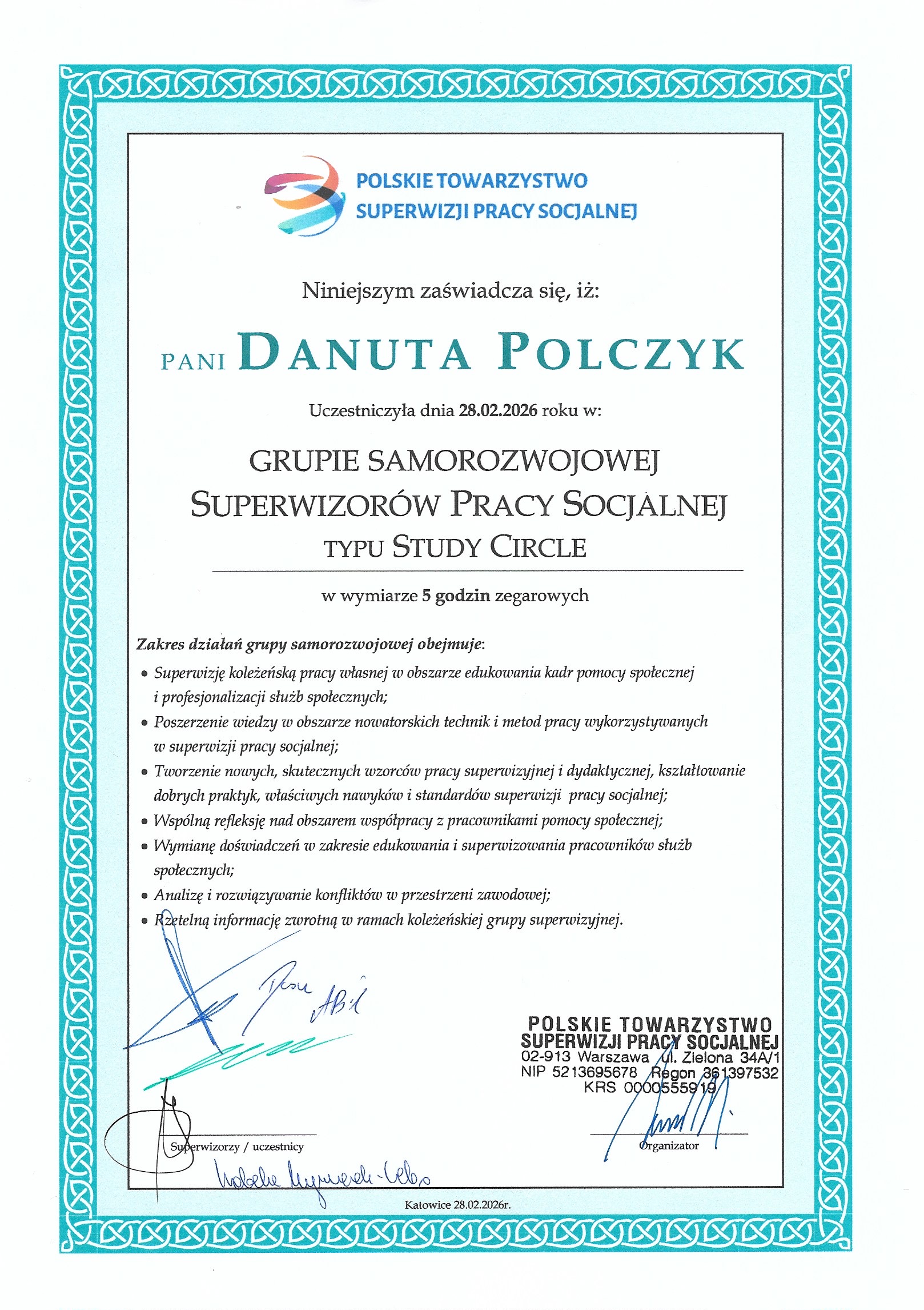 - Członkostwo (od 2016) w Polskim Towarzystwie Superwizji Pracy Socjalnej.
