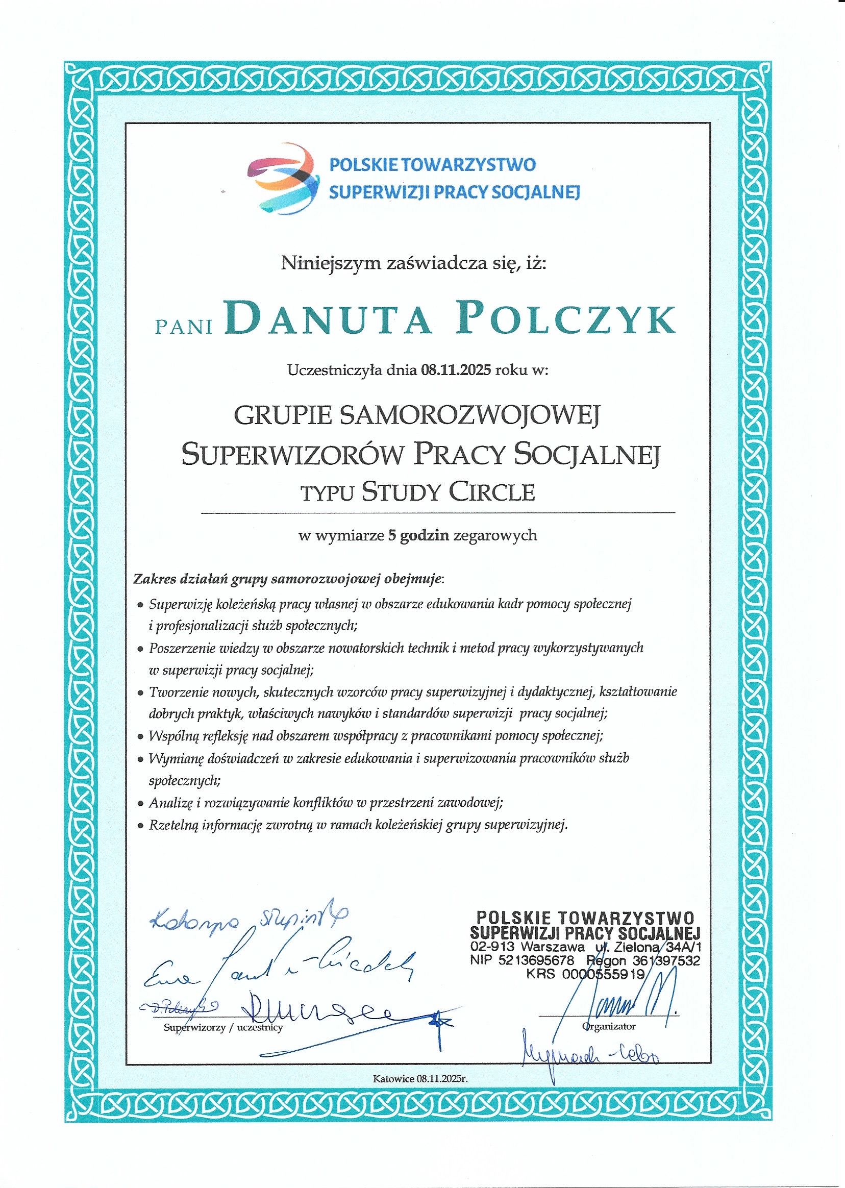 - Grupa Samorozwojowa Superwizorów Pracy Socjalnej Typu STUDY CIRCLE : 02.03.2019, 30.03.2019, 25.05.2019, 26.10.2019, 23.11.2019, 05.02.2022, 03.02.2024, 20. 04. 2024, 25.05.2024, 08.11.2025, 28.02.2026